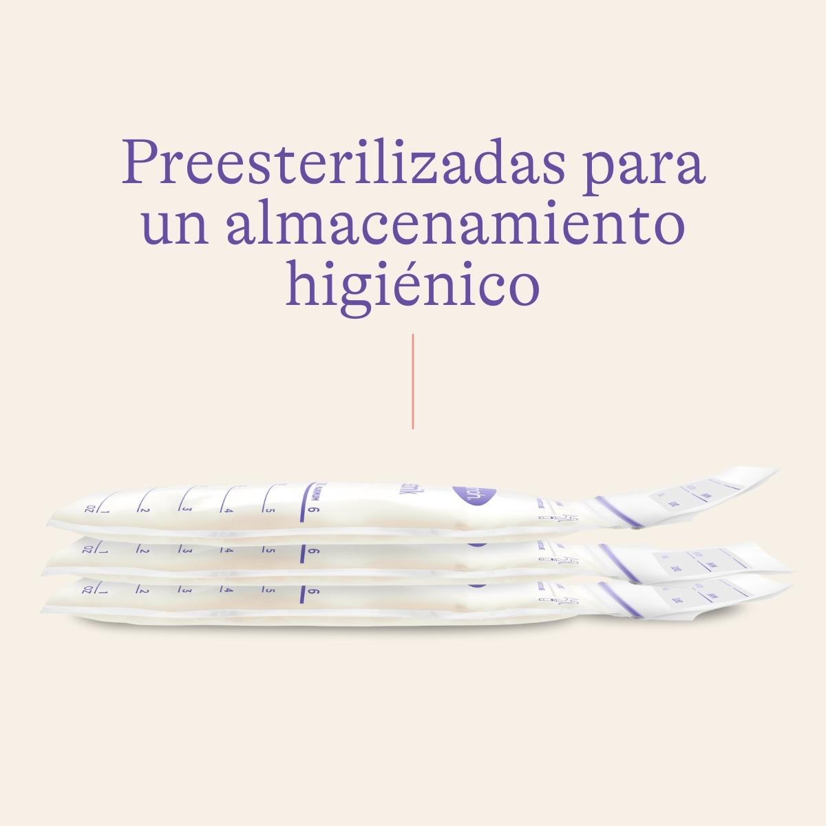 Incluyen un cierre higiénico de seguridad con prueba de apertura, y un doble sellado para evitar derrames o pérdidas. Las bolsas están preesterilizadas y no contienen plastificantes ni substancias dañinas que puedan contaminar la leche almacenada.