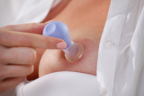 Cuando tu bebé esté en posición de mamar, aprieta suavemente la pera y coloca el cono sobre y alrededor del pezón.